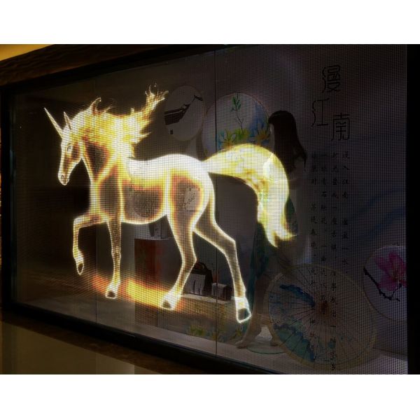 High-performance transparent LED film screen designed for window glass advertising displays in shopping malls and commercial spaces. Features 85% transparency and customizable sizes for versatile installation.